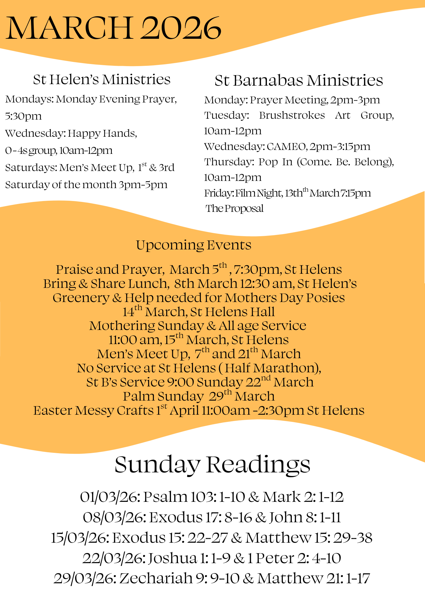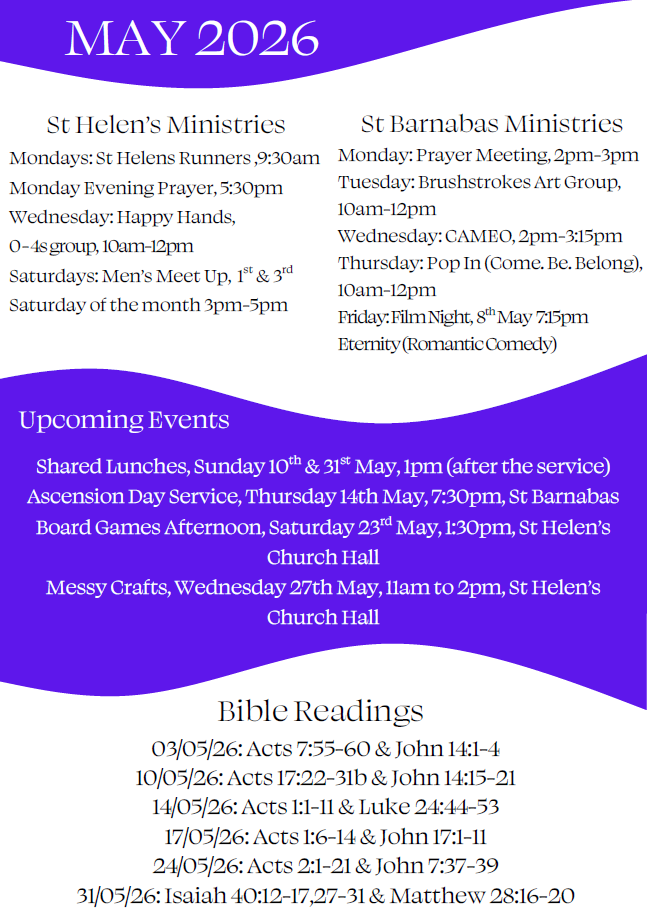 Join us for Sunday worship at St Barnabas from 9am and St Helen’s from 11am.
